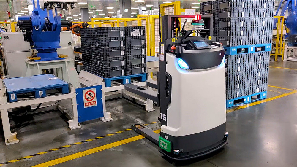 自动化程度较高的无人叉车。无人驾驶,通过传感器、激光或磁轨导航,在仓库中自动运输托盘。