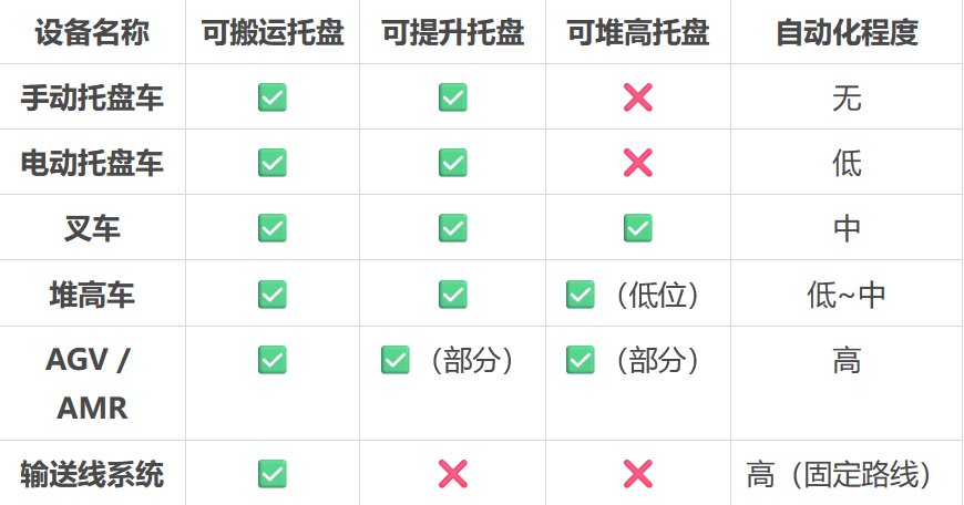 根据使用场景和自动化程度的不同,搬运托盘常用的设备主要有以下几类: